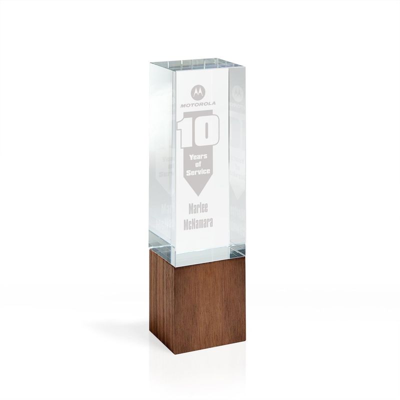 Brilliant optic crystal prism highlighting your custom engraving perches atop satin-finish walnut base suitable for the highest levels of recognition.