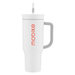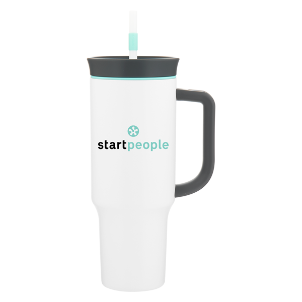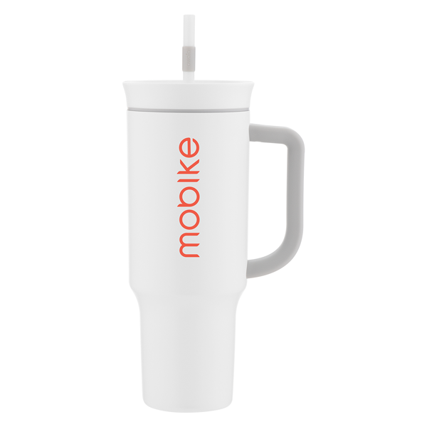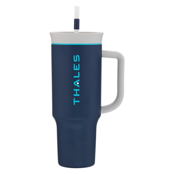 40 oz double wall 18/8 stainless steel thermal mug with vacuum insulation, dual-purpose threaded lid, sip and straw openings, straw, and powder coated finish