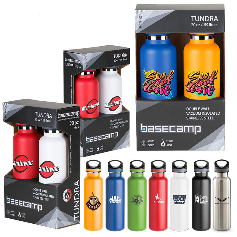 The perfect pair of 20 oz narrow mouth Tundra bottles packaged together in a sturdy cardboard box.
