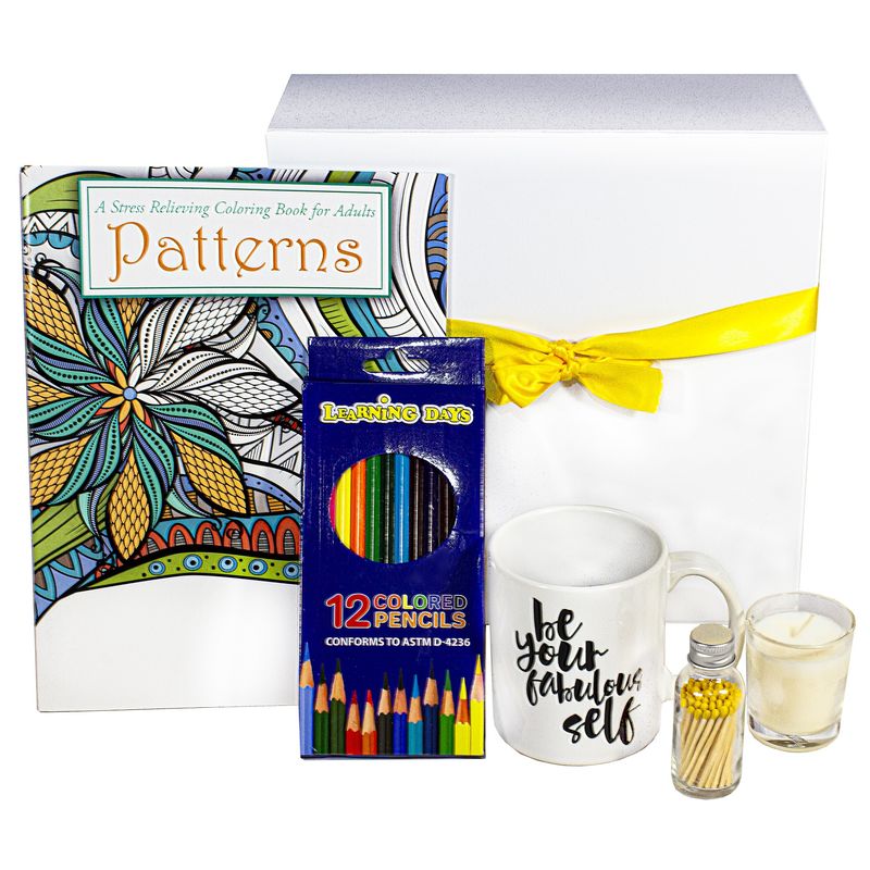 Includes a Stress Relieving Adult Coloring books along with Colored Pencils, Be Your Fabulous Self Coffee Cup, Vanilla Cream Candle, and Yellow tipped matches.