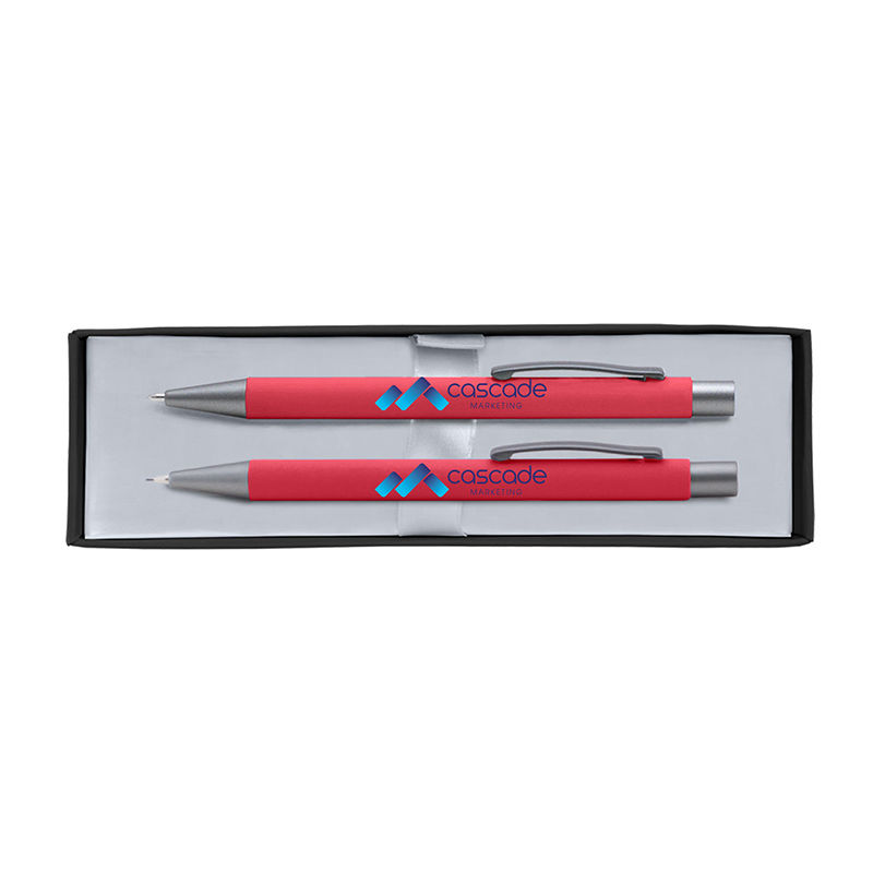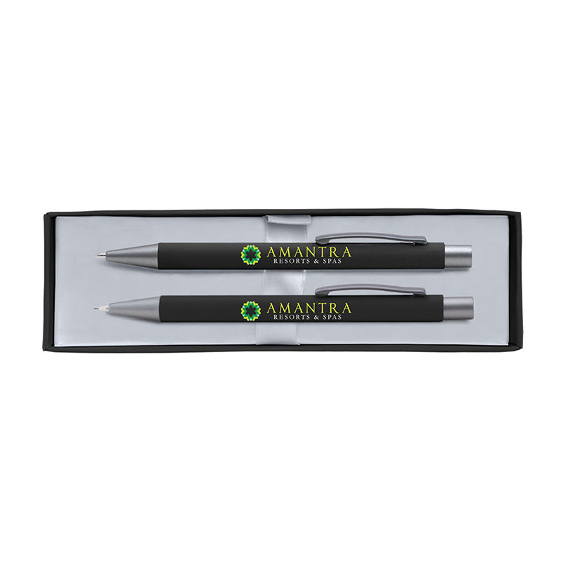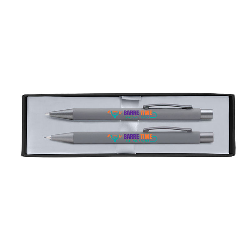 This gift set includes a ballpoint pen and mechanical pencil, both featuring the soft-touch rubberized finish.