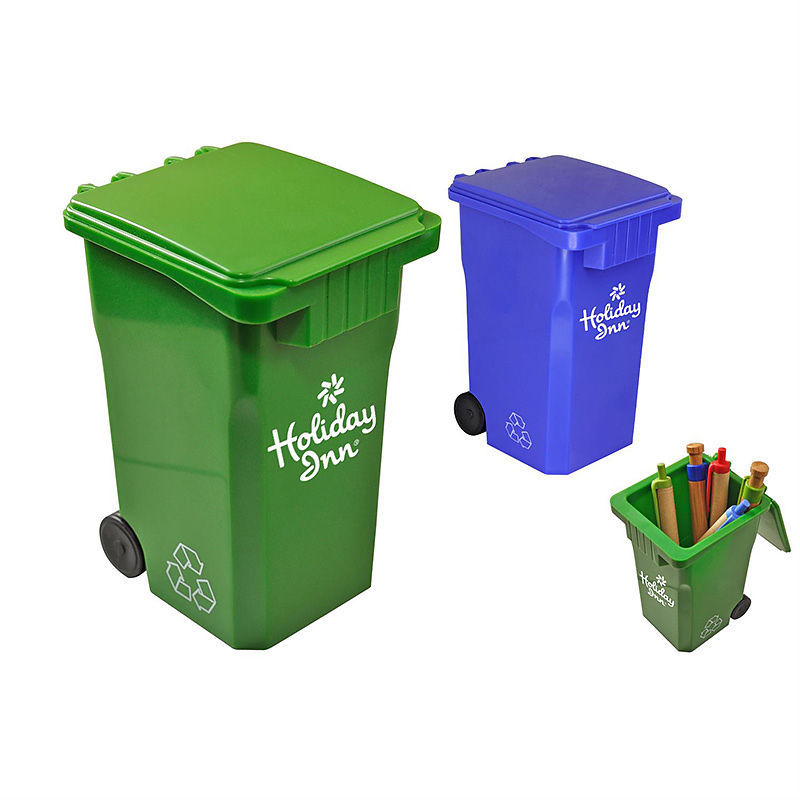 Recycle bin with hinged lid and wheels makes perfect pen holder.