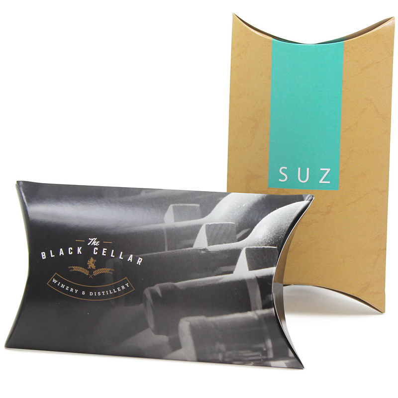Custom printed pillow boxes (sometimes called pillow packs) are a great way to build your company's presence. Printed in full color on the front, back, and flaps, these custom pillow boxes are large enough for gifts like ties and soap, or add some tissue paper for smaller gifts like jewelry, pens, or knick knacks.
