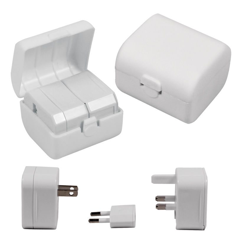 • ABS Plastic travel adapter with components for us in the US, UK, EU, and AU.