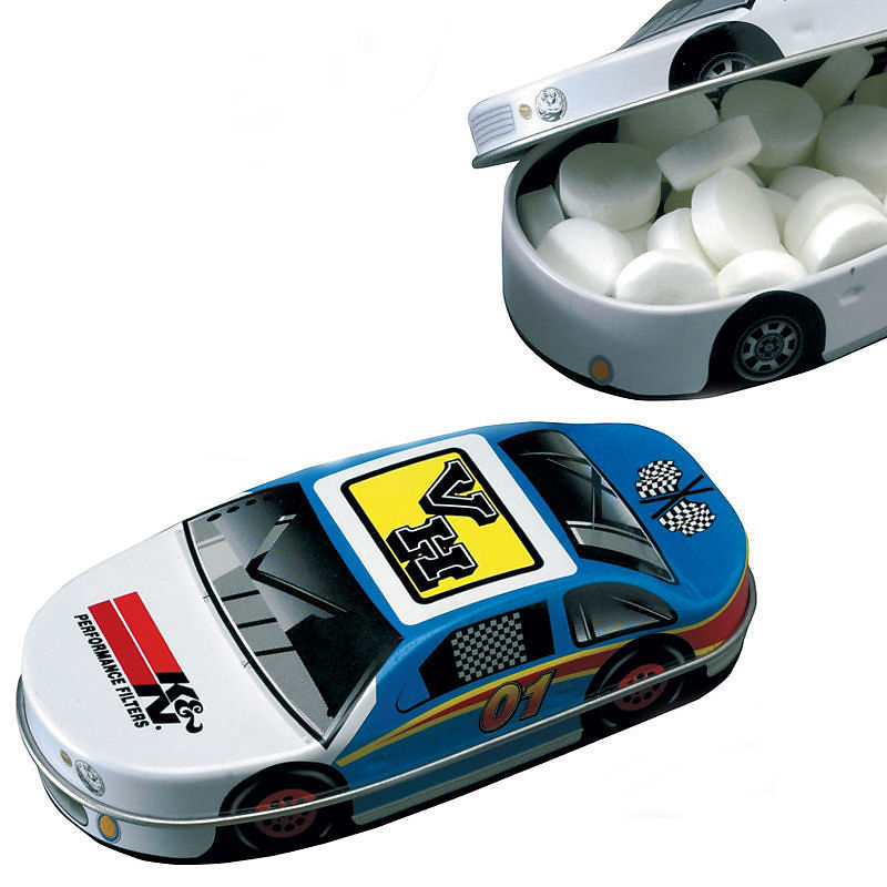 Put your promotion in high gear with our race car shaped mint tin filled with English mints. There is no better way to say "fast", high performance or race when talking about your product highlights or speed of service.
