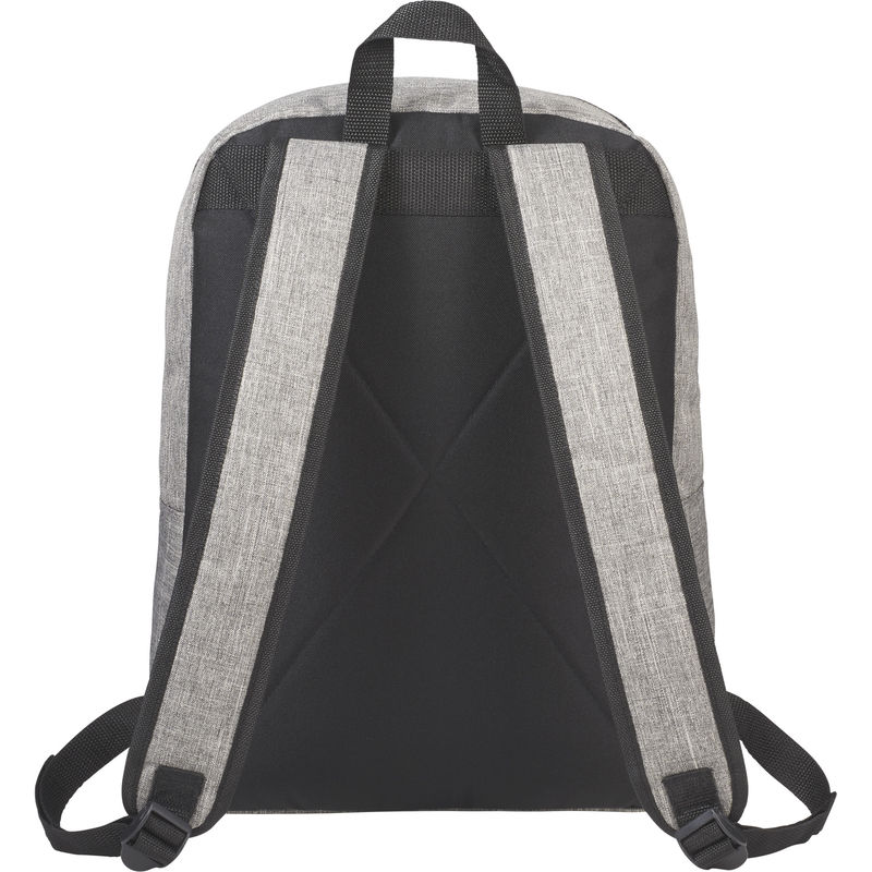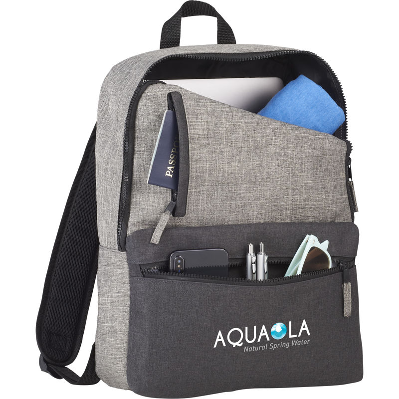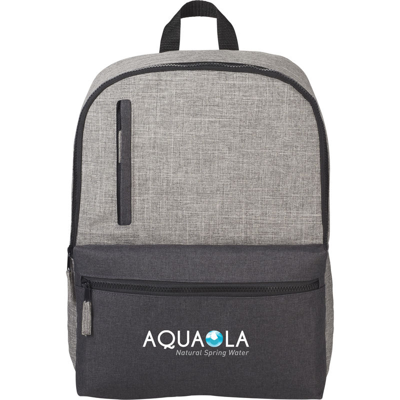 This backpack features two zippered front pockets as well as a zippered main compartment with 15" laptop sleeve.