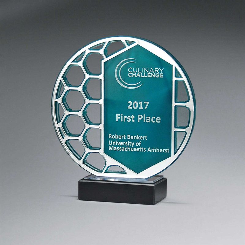 Circle Lucite award with a geometric mirror design on top of black Lucite, this design reflects excellence.