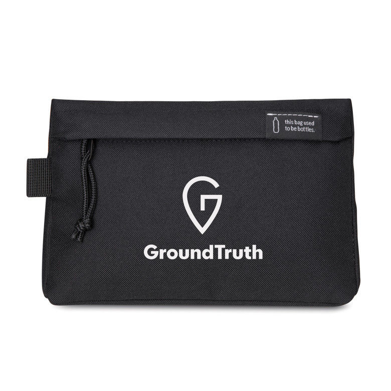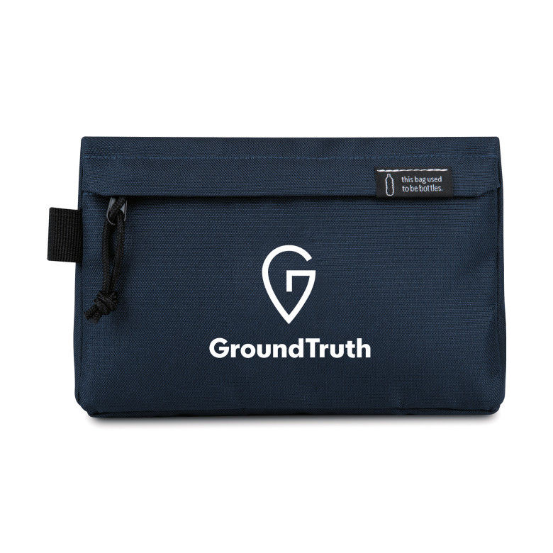 A modern and sustainable update to a classic pouch using recycled fabric and webbing made from plastic bottles.