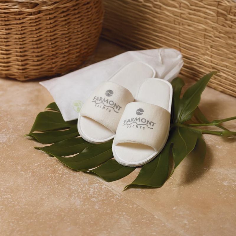 Imprint Method: embroidery on robe, screen printing on slippers and bag