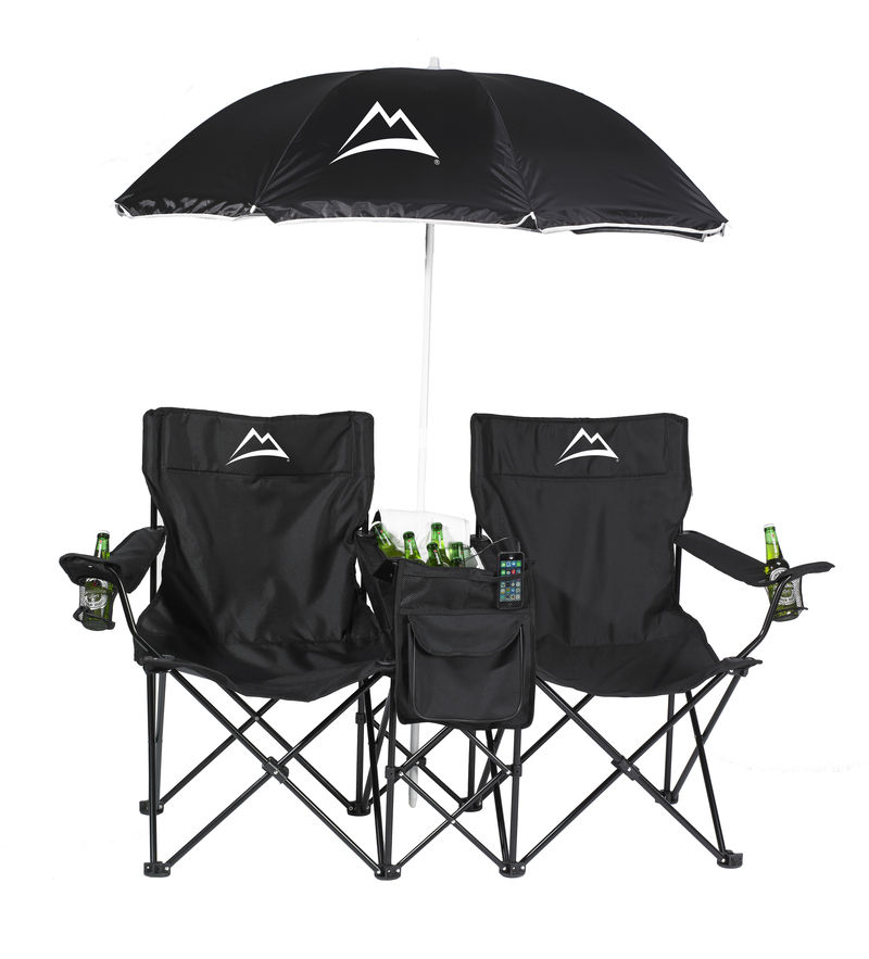 • Includes two chairs with connected beach umbrella and 12-can soft cooler with front pocket