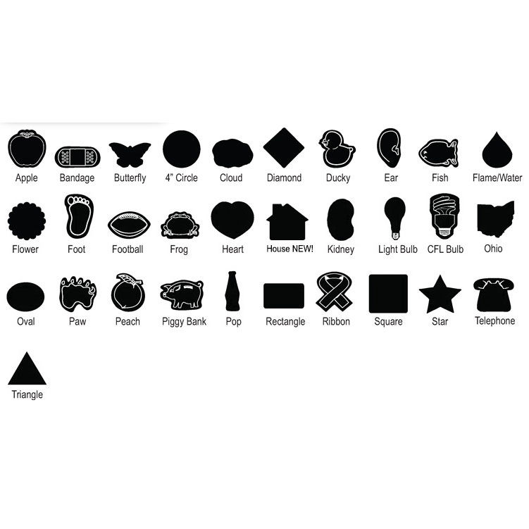 Product/Part Colors 1: Shapes: apple, bandage, butterfly, circle, cloud, diamond, ducky, ear, fish, flame, water, flower, foot, football, frog, heart, house, kidney, light bulb, cfl bulb, Ohio, oval, paw, peach, piggy bank, pop, rectangle, ribbon, square, star, telephone, triangle