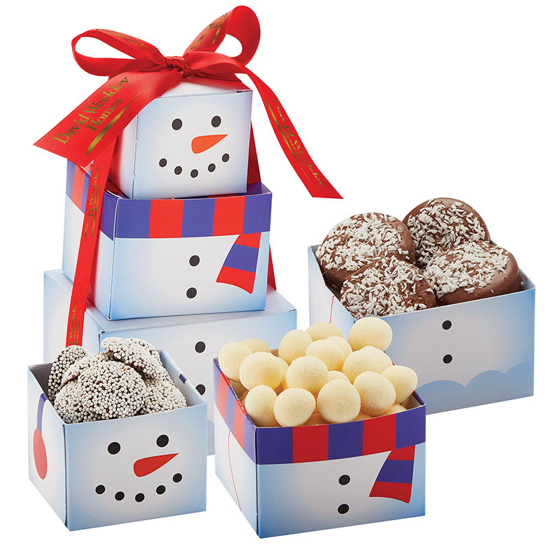 Snowman Tower filled with Sugar Cookie Snowballs, Dark Chocolate Nonpareils and 4 Chocolate Covered Oreos® with Shredded Coconut