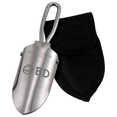 This all-stainless-steel shovel features a folding handle and comes in a black nylon carrying case with belt loop and velcro closure.