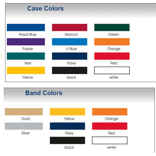Product/Part Colors 1: CASE COLORS: royal blue, maroon, green, purple, light blue, orange, teal, navy, red, yellow, black, white. BAND COLORS: gold, silver, yellow, orange, navy, red, black, white