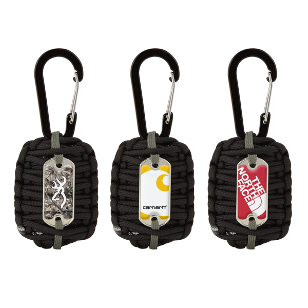 Kaiser black and gray paracord survival grenade with 17 survival tools inside and full color dome on silver dog tag.