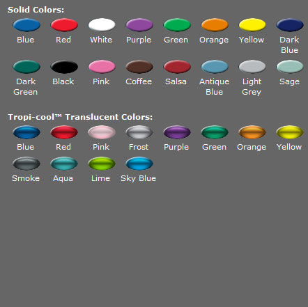 Product/Part Colors 2: Translucent colors: Blue, Red, Pink, Frost, Purple, Green, Orange, Yellow, Smoke, Aqua, Lime, Sky Blue