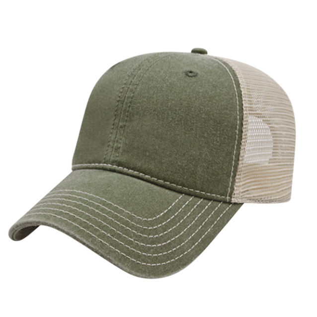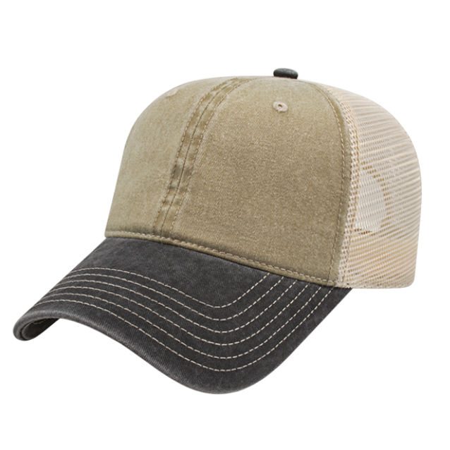 • Washed pigment dyed cotton twill with washed trucker mesh