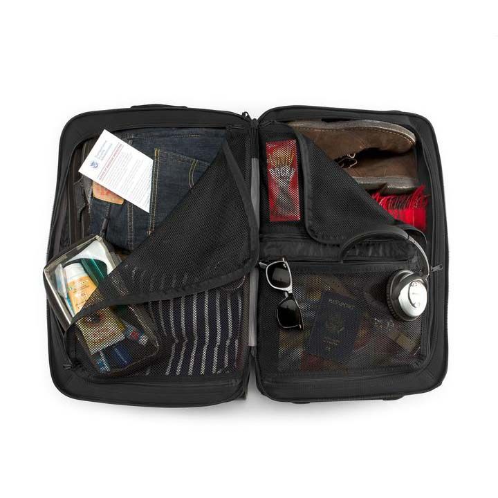 • Expandable top compartment for quarantining shoes and toiletries