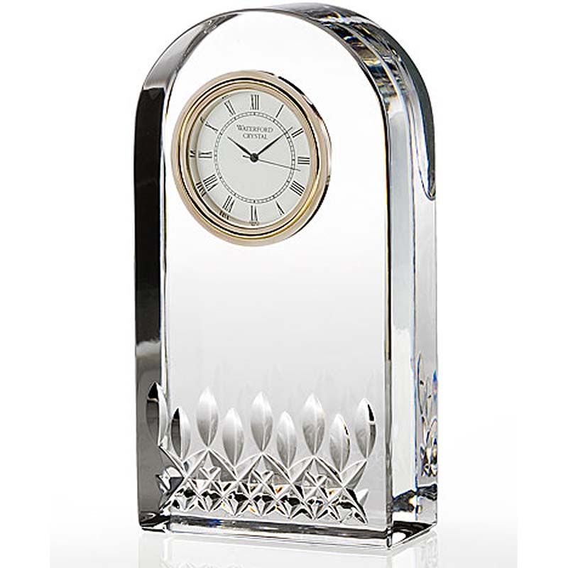 An elegant addition to any mantle or desk, this Lismore Clock features an elegant cream clockface with Roman numerals & brass finish, set in fine, handcrafted crystal intricately detailed with Lismore's signature diamond & wedge cuts.5 1/2"H, 2 3/4" W.