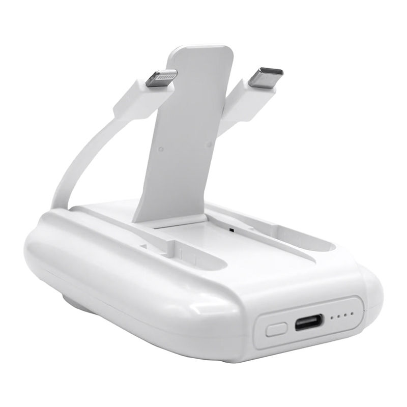 It features a collapsible phone stand for hands-free use, lightning-compatible and USB-C charging cables, and a versatile USB-C input/output