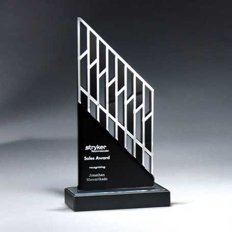Angular tower Lucite award with a geometric mirror design on top of black Lucite, this design reflects excellence.