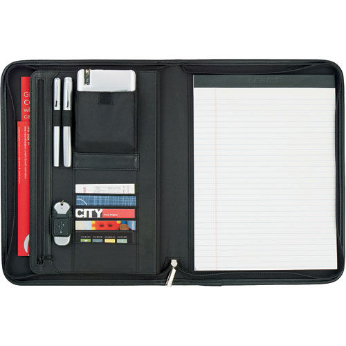 • Interior organizer features multiple business card pockets, clear ID window, gusseted file pocket, elastic media and pen loops, and accessory pouch with Velcro closure.