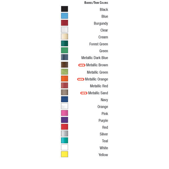 Product/Part Colors 1: Barrel/Trim: Black, Blue, Burgundy, Clear, Cream, Forest Green, Green, Metallic Dark Blue, Metallic Brown, Metallic Green, Metallic Orange, Metallic Red, Metallic Sand, Navy, Orange, Pink, Purple, Red, Silver, Teal, White, Yellow